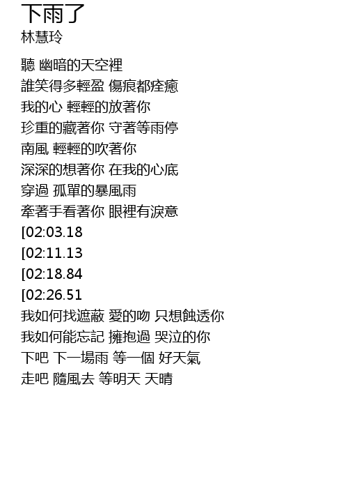 | [03:53.79] | 下吧 下一場雨 等一個 好天氣 |