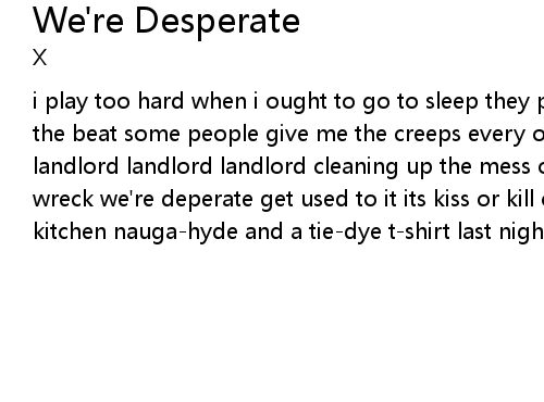 | i play too hard when i ought to go to sleep they pick on me because i really got the beat some people give me the creeps every other week i need a new address landlord landlord landlord cleaning up the mess our whole fucking life is a wreck we're deperate get used to it its kiss or kill coca-cola and a motorola kitchen nauga-hyde and a tie-dye t-shirt last night everything broke |
