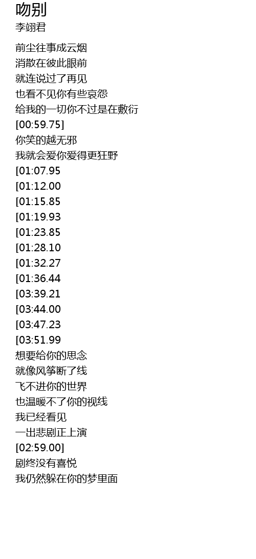 | [03:59.11][03:39.21][01:39.91] | 我和你吻别在无人的街 |