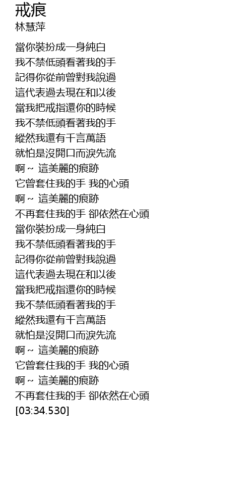 | [03:24.390] | 不再套住我的手 卻依然在心頭 |