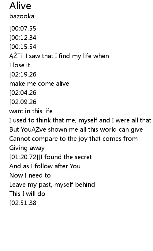 | [02:33.79][02:19.26][02:15.18][02:00.67][01:57.07][01:31.20][01:16.74][01:12.74][00:46.82][00:31.98][00:28.54] | You make me come alive |