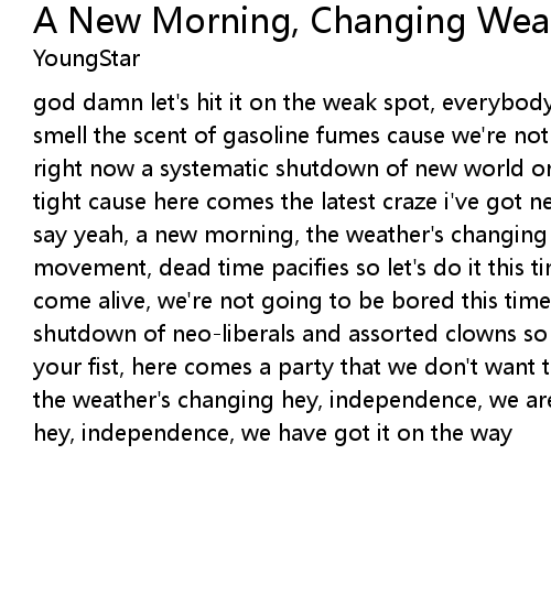 god damn let's hit it on the weak spot, everybody knows that we all had enough smell the scent of gasoline fumes cause we're not victims and we know what to do right now a systematic shutdown of new world orders and restructuring plans hold tight cause here comes the latest craze i've got news baby and this is what i say yeah, a new morning, the weather's changing god damn let's build a new movement, dead time pacifies so let's do it this time all these slogans will come alive, we're not going to be bored this time right now a systematic shutdown of neo-liberals and assorted clowns so strike the match and baby clench your fist, here comes a party that we don't want to miss yeah, a new morning, the weather's changing hey, independence, we are playing a little game, i said hey, independence, we have got it on the way |