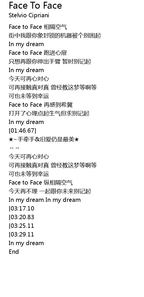 | [03:33.75][03:17.10][02:59.69] | Face to Face 再跑进心扉 |