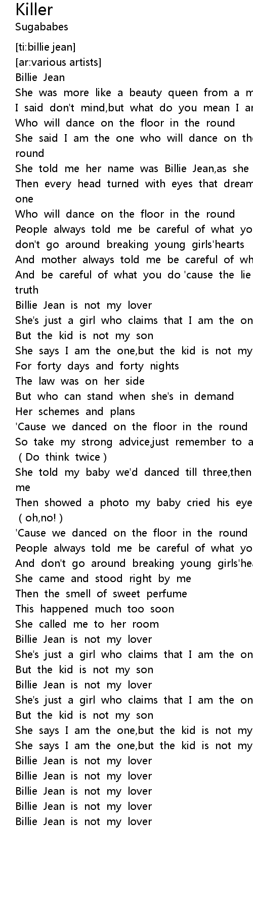 | [00:44.17] | She told me her name was Billie Jean, as she caused a scene |