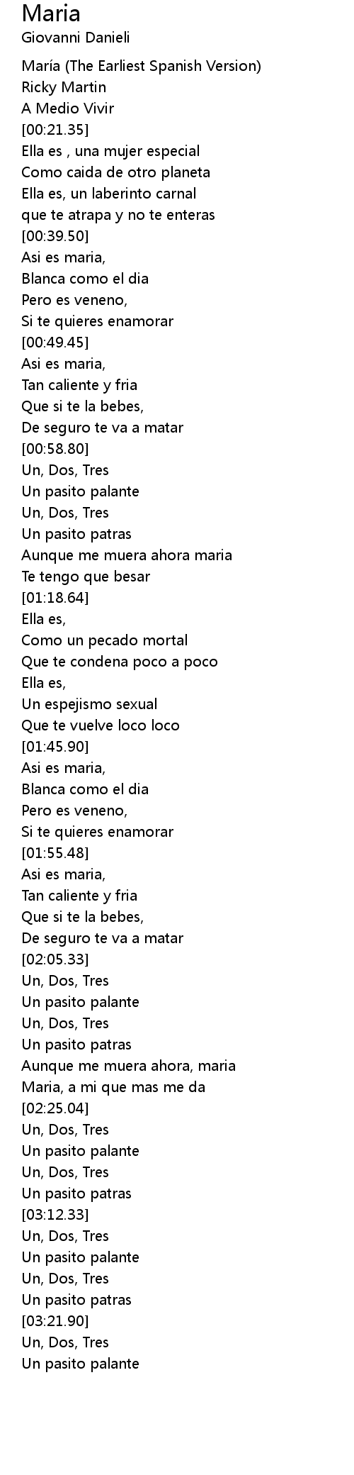 | [00:04.20] | María (The Earliest Spanish Version) |