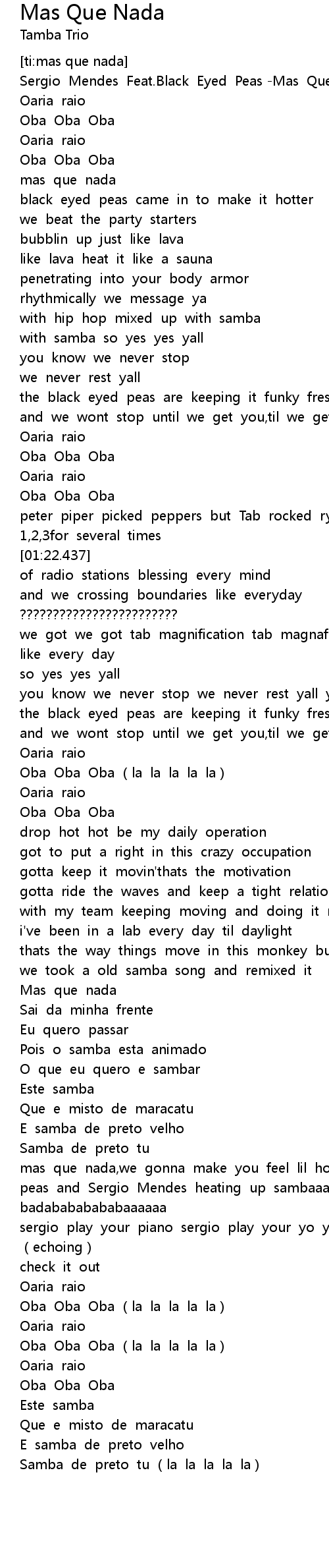 | [00:08.113] | Sergio Mendes Feat. Black Eyed Peas Mas Que Nada |
