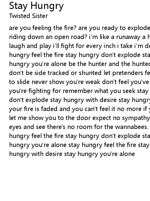 are you feeling the fire? are you ready to explode? are your dreams and desires riding down an open road? i'm like a runaway a heart without a home others can laugh and play i'll fight for every inch i take i'm desperate to the bone stay hungry feel the fire stay hungry don't explode stay hungry with desire stay hungry you're alone be the hunter and the hunted keep your target in your sight don't be side tracked or shunted let pretenders feel your bite and if you start to slide never show you're weak don't feel you've got to hide remember what you're fighting for remember what you seek stay hungry feel the fire stay hungry don't explode stay hungry with desire stay hungry you're alone all right! if your fire is faded and you can't feel it no more if you're tired and overrated let me show you to the door expect no sympathy there's none to be had open your eyes and see there's no room for the wannabees. the has beens or the bad stay hungry feel the fire stay hungry don't explode stay hungry with desire stay hungry you're alone stay hungry feel the fire stay hungry don't explode stay hungry with desire stay hungry you're alone |