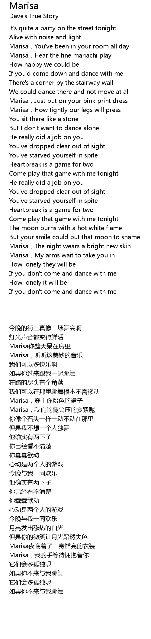 | [03:20.390] | Marisa,My arms wait to take you in |