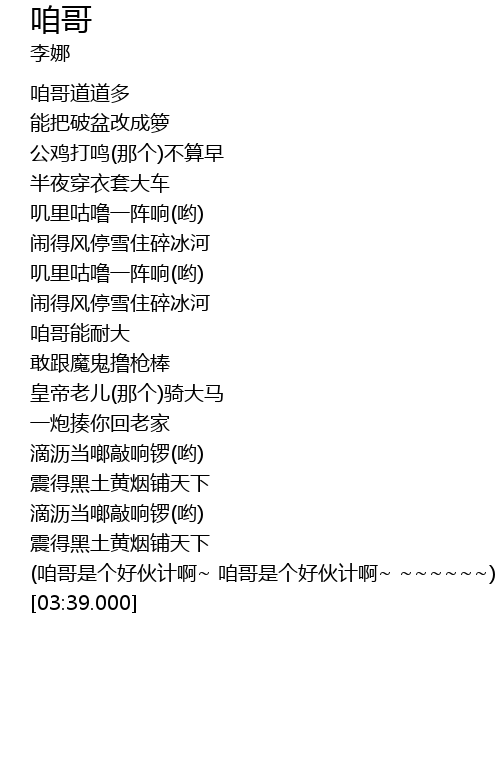 | [02:55.000] | (咱哥是个好伙计啊~ 咱哥是个好伙计啊~ ~~~~~~) |