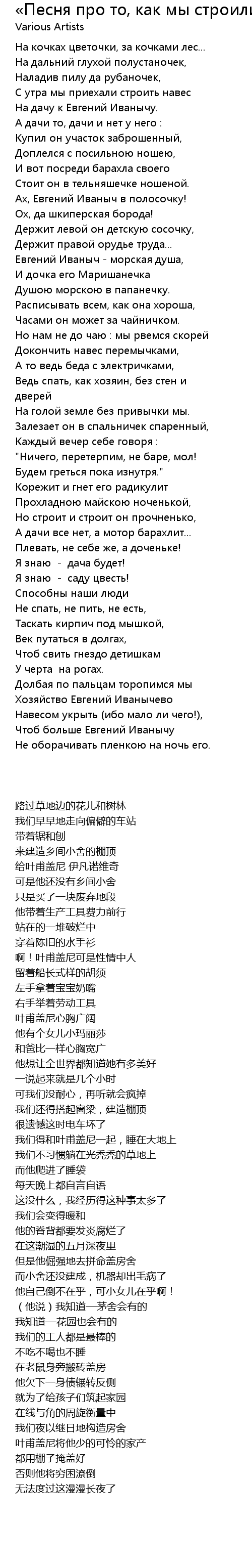 | 歌曲 | «Песня про то, как мы строили навес на даче у Евгения Иваныча» (музыка Алексей Иващенко, слова Георгий Васильев) |