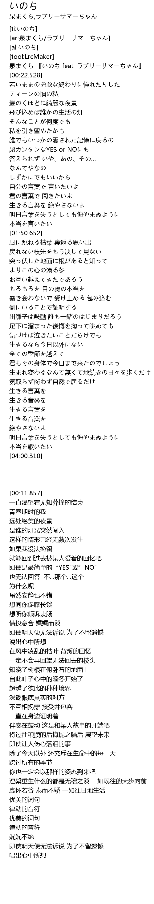 | [00:11.857] | 泉まくら 『いのち feat. ラブリーサマーちゃん』 |