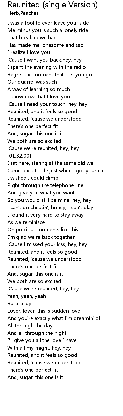 | [01:25.00] | 'Cause we're reunited, hey, hey |