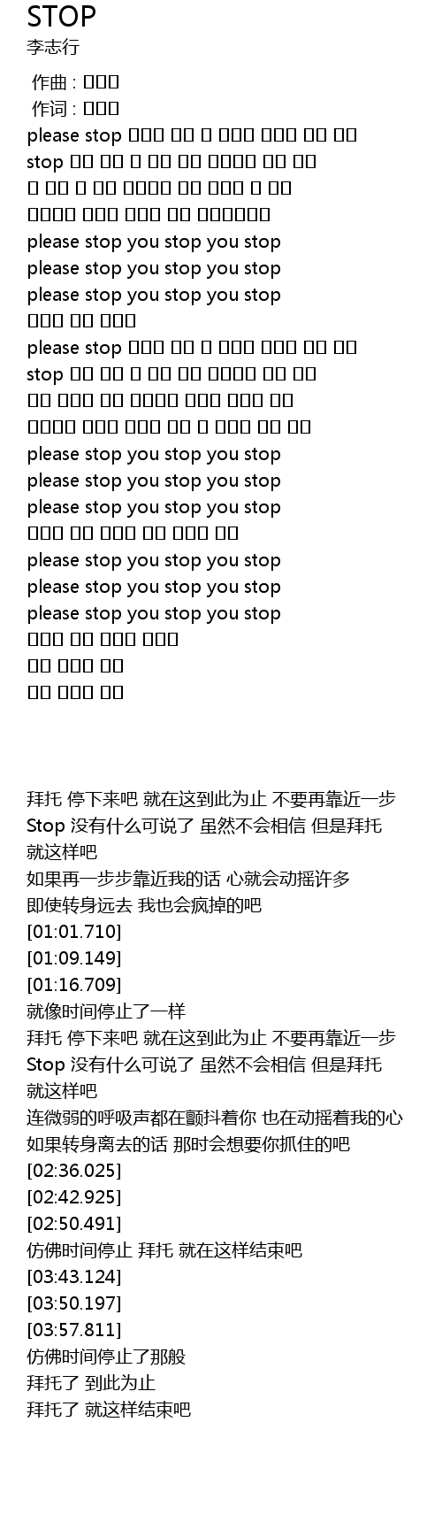 | [01:50.396] | Stop 没有什么可说了 虽然不会相信 但是拜托 就这样吧 |