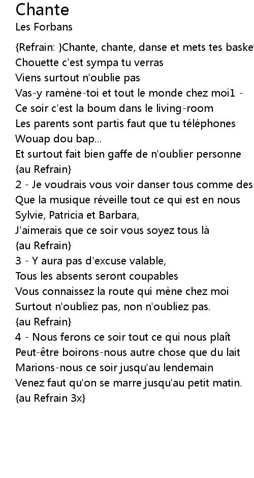 | {Refrain: }Chante, chante, danse et mets tes baskets | |