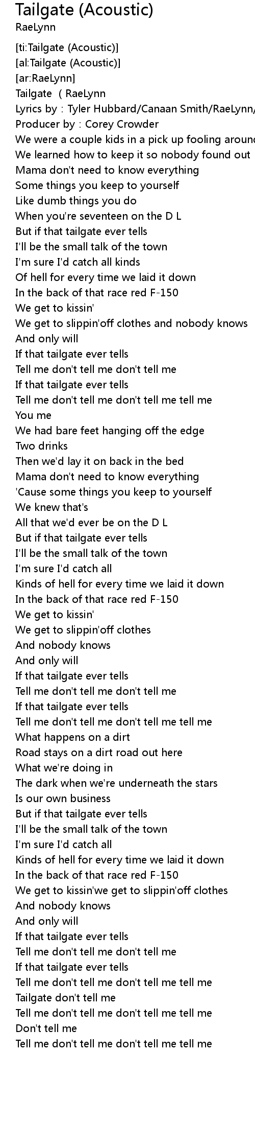 | [02:43.157] | Tailgate don't tell me |