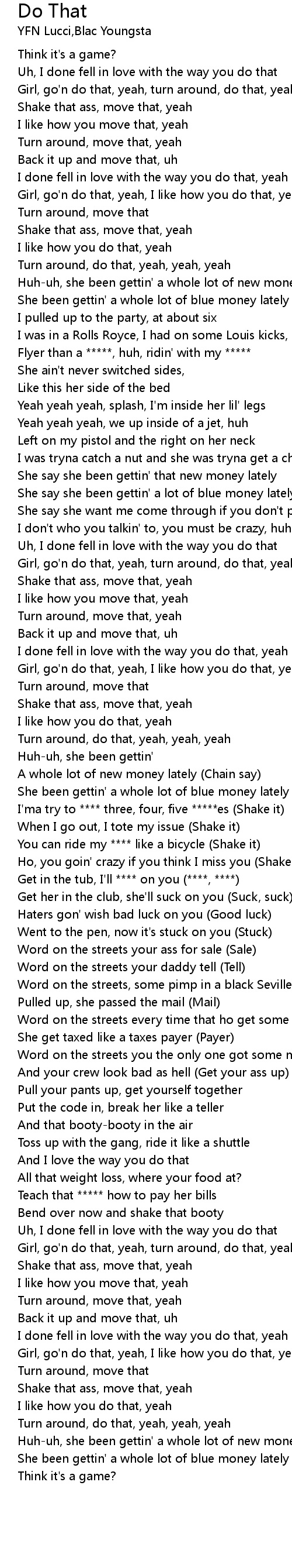 | [00:53.41] | Yeah yeah yeah, splash, I'm inside her lil' legs |