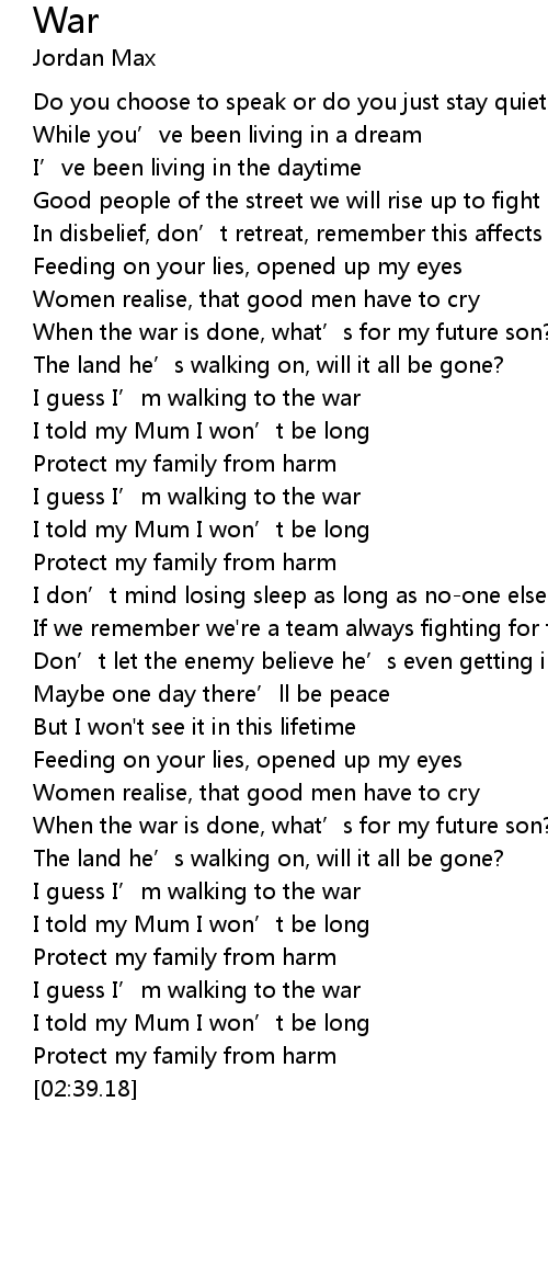 | [00:49.44] | When the war is done, what’s for my future son? |