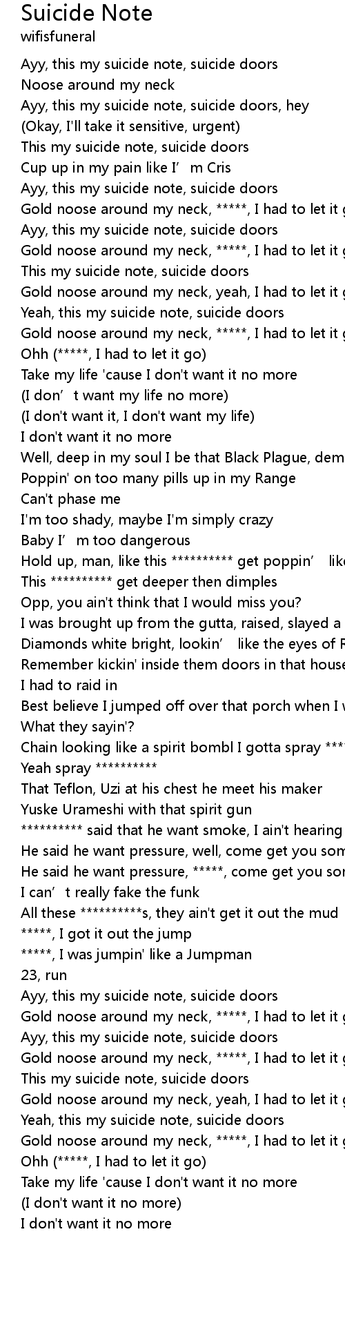 | [00:04.91] | Ayy, this my suicide note, suicide doors |