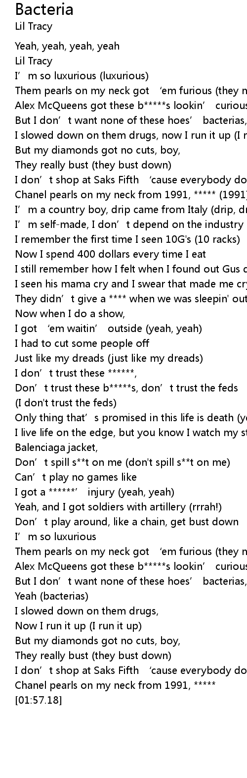 | [00:20.39] | But I don' t want none of these hoes' bacterias, yeah |
