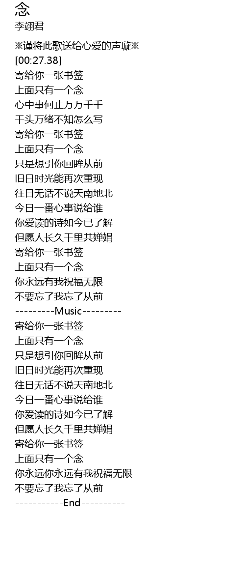 | [00:30.61] | jì gěi nǐ yī zhāng shū qiān |