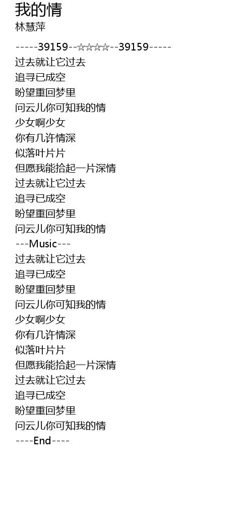 | [00:42.91] | wèn yún ér nǐ kě zhī wǒ de qíng |