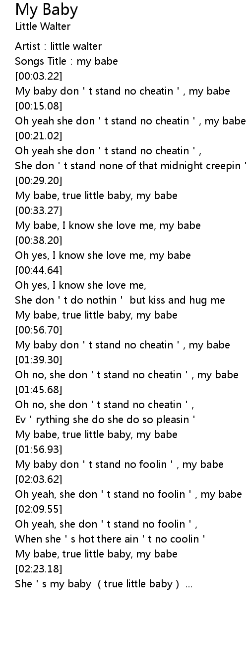 | [00:11.33] | My baby don t stand no cheatin, my babe |