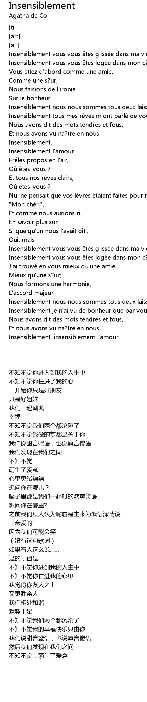 | [00:13.53] | Insensiblement vous vous tes glisse e dans ma vie, |