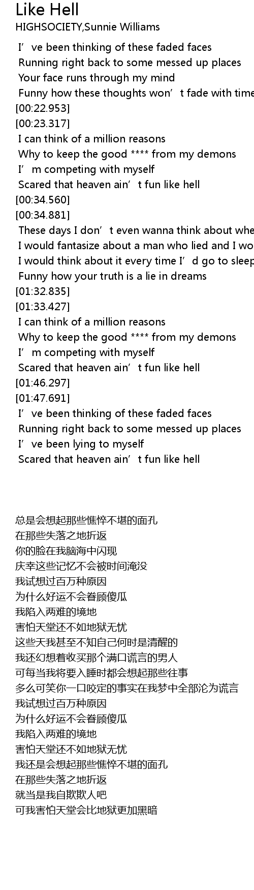 | [00:32.169] | Scared that heaven ain' t fun like hell |