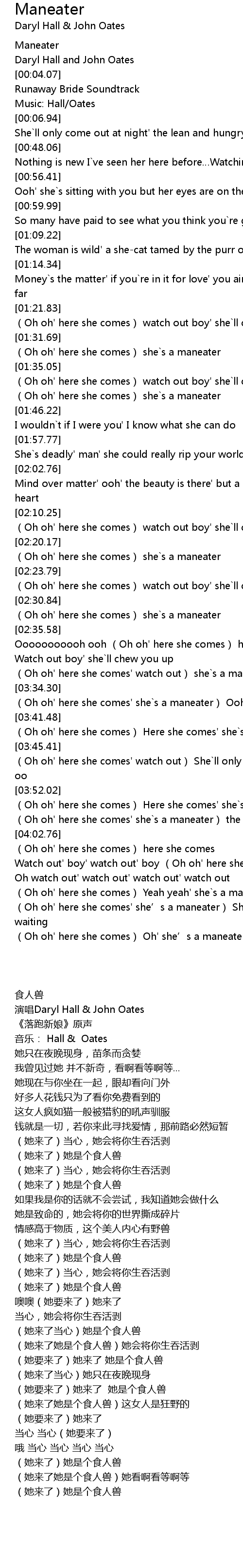 | [04:21.10] | (Oh oh' here she comes) Oh' she’s a maneater |