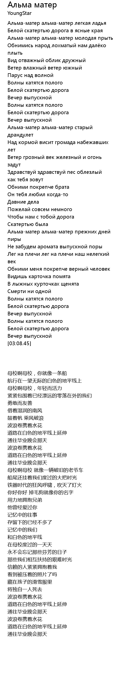 | [02:04.12] | Альма-матер альма-матер прежних дней пиры |