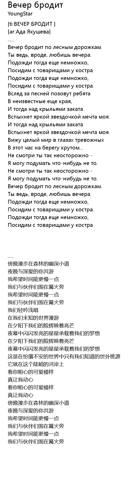 | [00:09.21] | Вечер бродит по лесным дорожкам. |