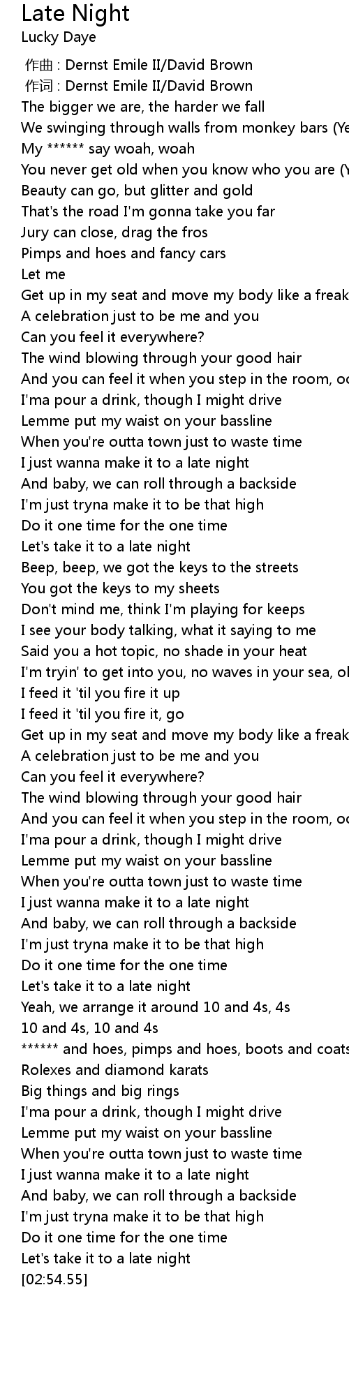 | [02:52.38] | Let' s take it to a late night |
