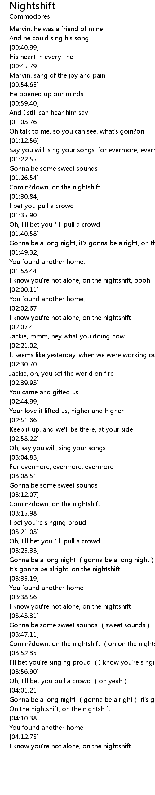 | [03:39.44] | I know you're not alone, on the nightshift |