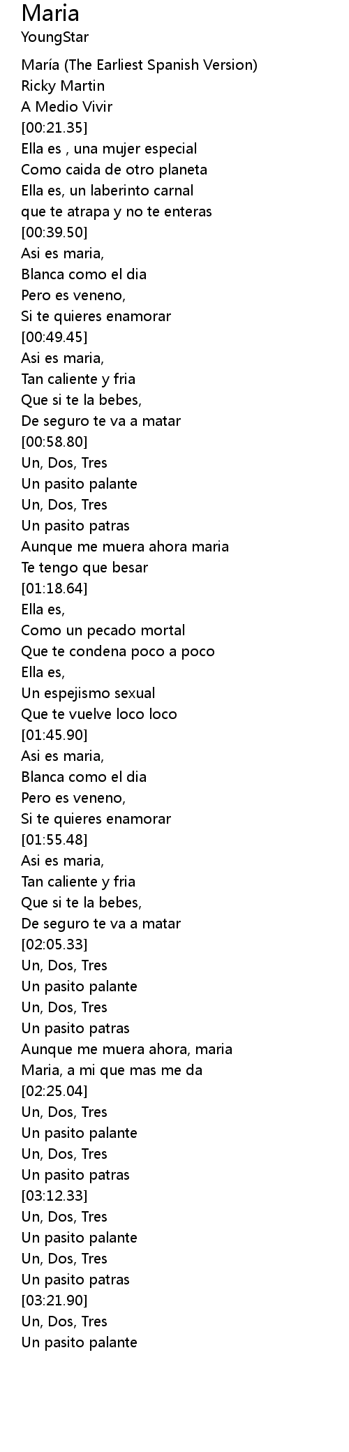 | [00:04.20] | María (The Earliest Spanish Version) |