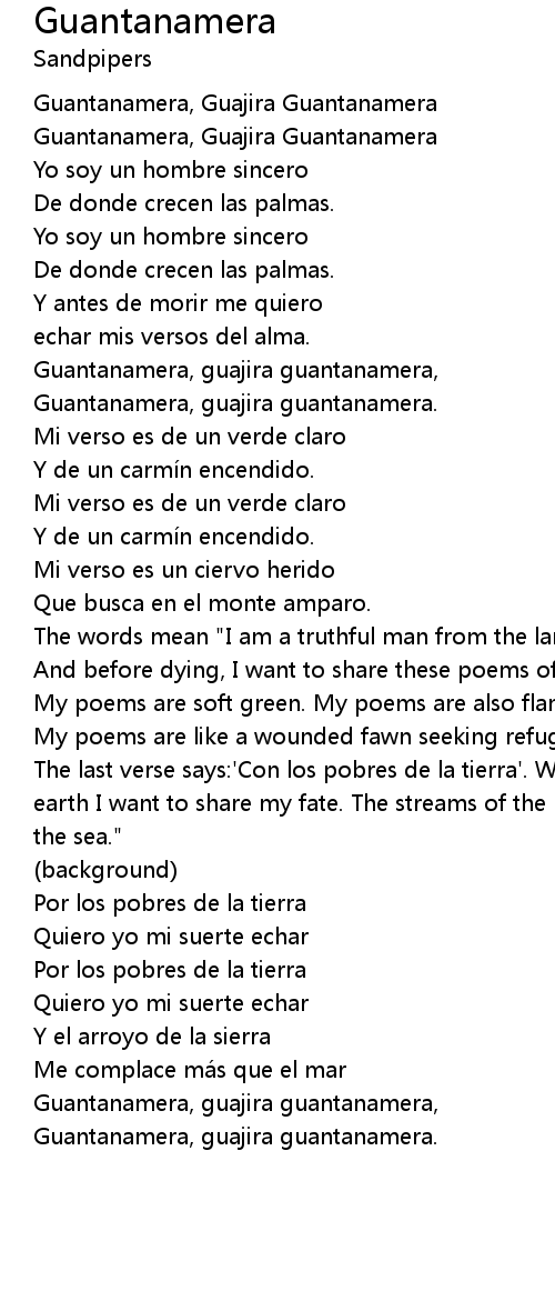 | The last verse says:'Con los pobres de la tierra'. With the poor people of this earth I want to share my fate. The streams of the mountains please me more than the sea." | |