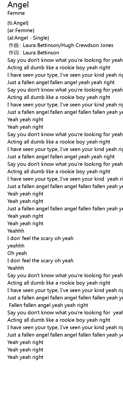 | [00:34.00] | Just a fallen angel fallen angel fallen fallen yeah yeah right |