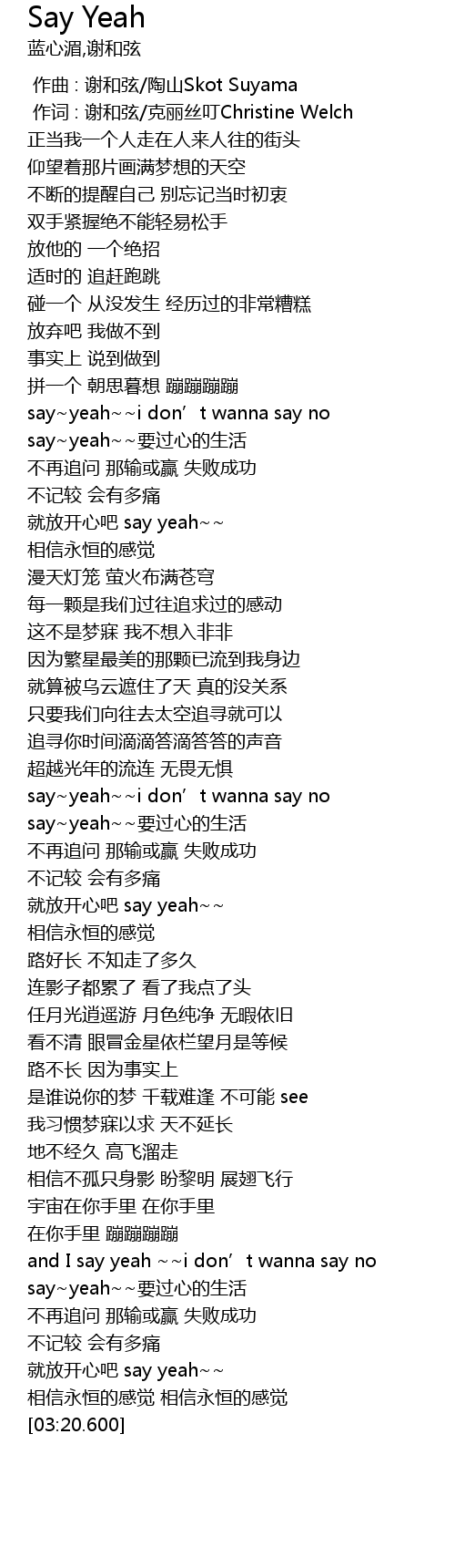 | [02:26.220] | and I say yeah i don' t wanna say no |