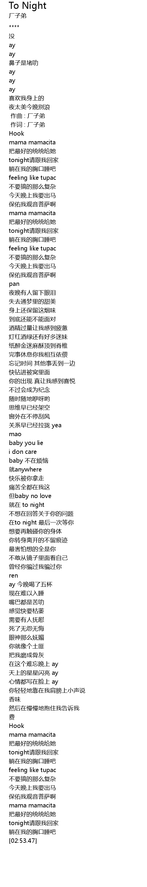 | [02:43.92] | tonight qǐng gēn wǒ huí jiā |