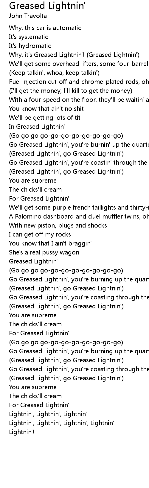 Go Greased Lightnin', you're burnin' up the quarter mile |