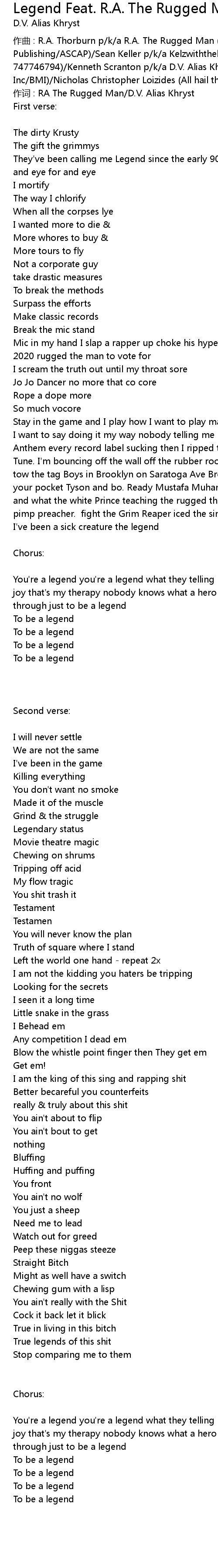| zuo qu : R. A. Thorburn p k a R. A. The Rugged Man Holmes Vs Cooney Publishing ASCAP Sean Keller p k a Kelzwiththeheat PRS CAE IPI 747746794 Kenneth Scranton p k a D. V. Alias Khryst Malad Mixture Inc BMI Nicholas Christopher Loizides All hail the honorable BMI | |