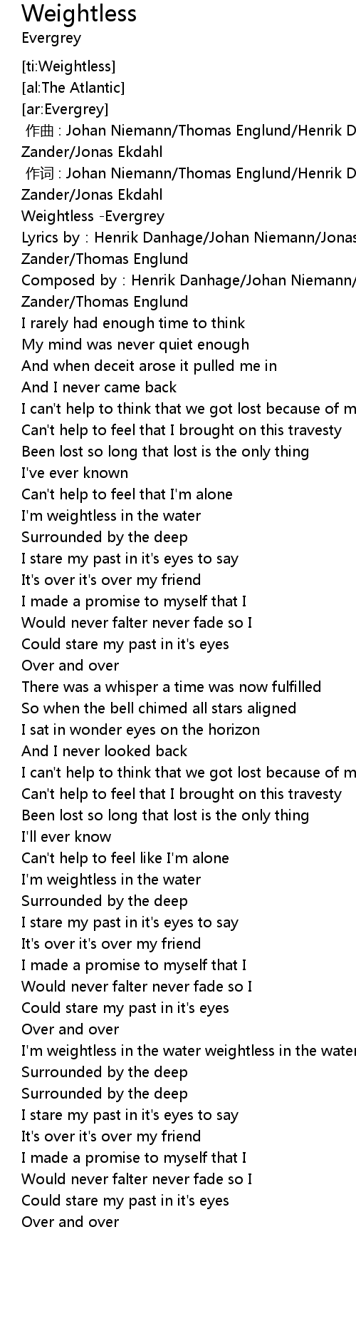 | [05:43.545] | I'm weightless in the water weightless in the water |