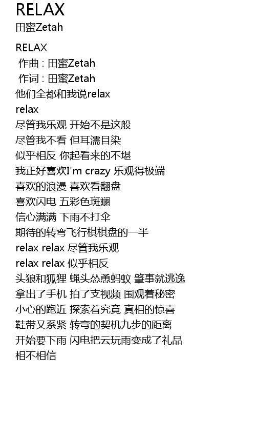 | [00:14.205] | tā men quán dōu hé wǒ shuō relax |