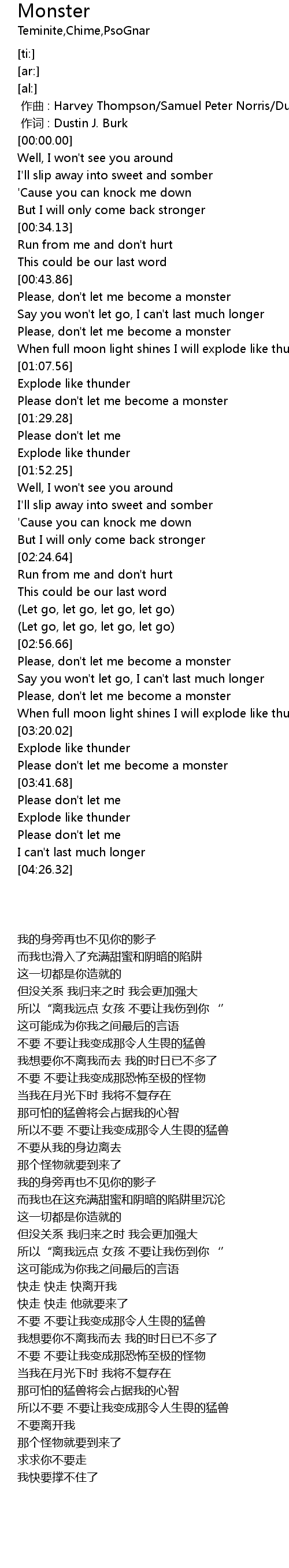 | [03:36.73] | Please don't let me become a monster |