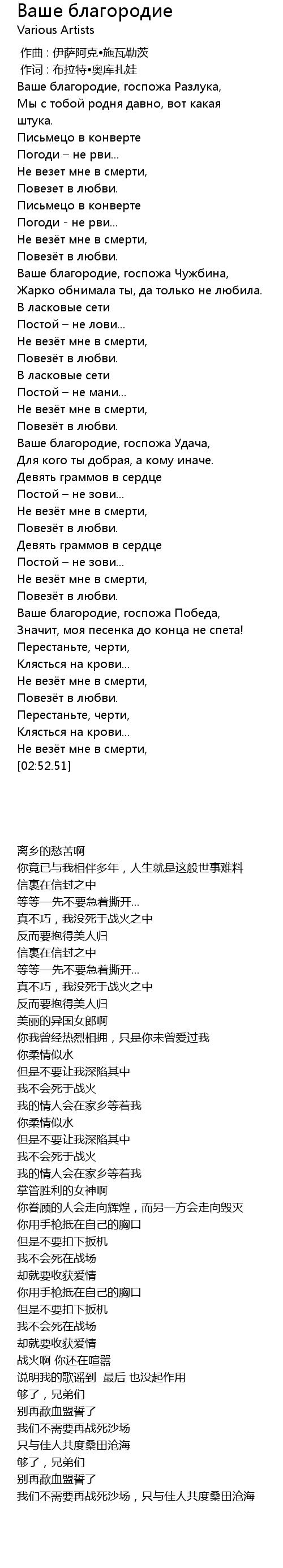 | [00:55.76] | Ваше благородие, госпожа Чужбина, |