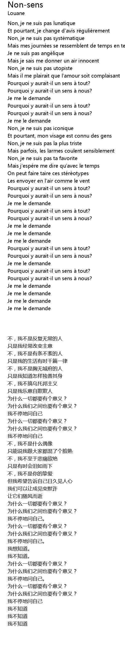 | [02:18.74] | Pourquoi y auraitil un sens à tout? |