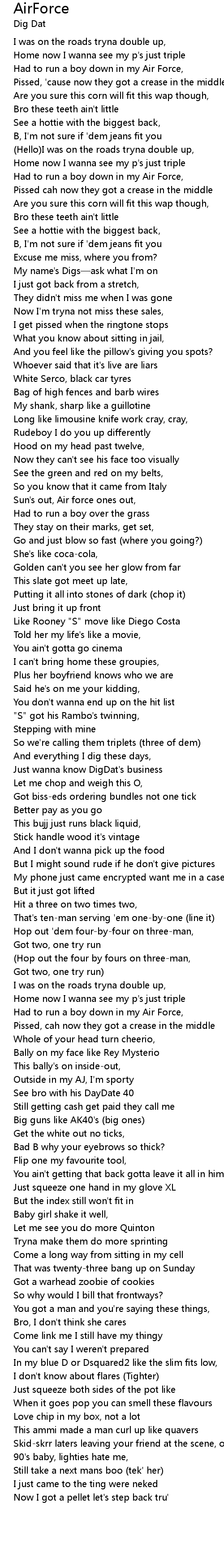 | [00:38.69] | Had to run a boy down in my Air Force, |