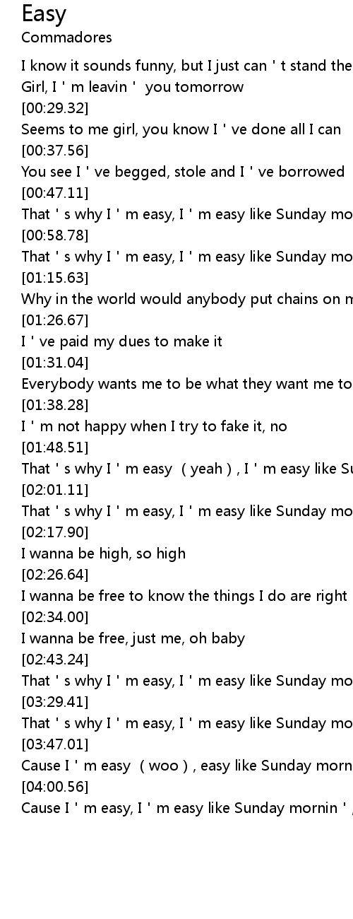 | [01:51.56] | That's why I'm easy (yeah), I'm easy like Sunday mornin' |