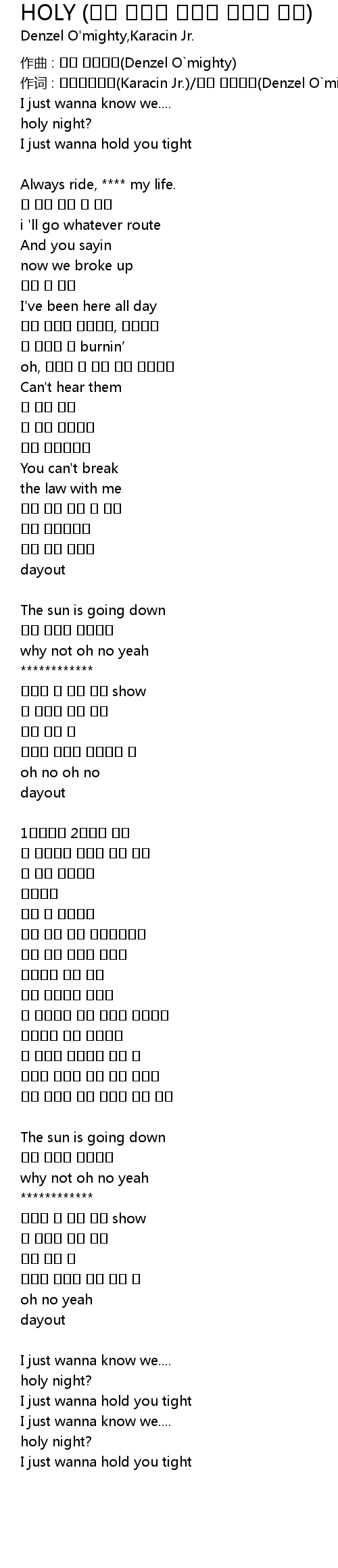 | 作词 : 카라신주니어(Karacin Jr.)/덴젤 오마이티(Denzel O`mighty) | |