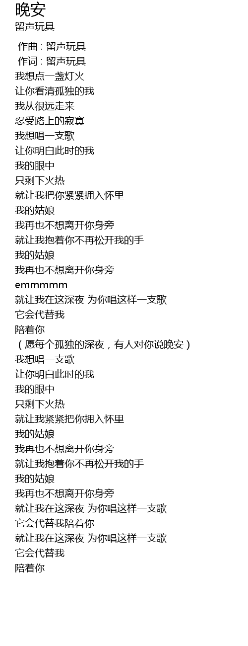 | [02:02.38] | (愿每个孤独的深夜,有人对你说晚安) |