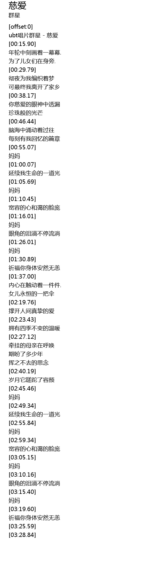 | [00:01.84] | ubt唱片群星 - 慈爱 |